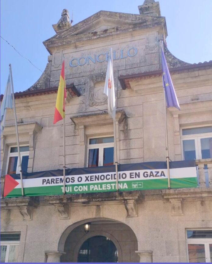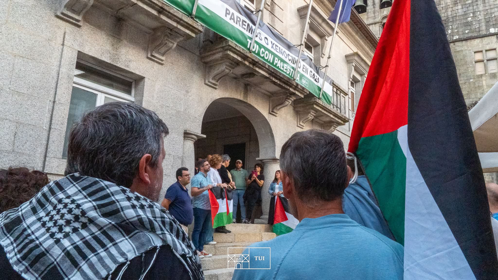 A vaga de ações tornou-se visível em concelhos como Allariz, onde a câmara municipal guardou um minuto de silêncio em resposta a uma convocatória da FEGAMP, num gesto descrito pela autarquia como um compromisso com a paz, os direitos humanos e o fim da violência. Em Tui, a mobilização foi mais além, com o próprio concelho a convocar uma concentração na praça do edifício municipal. No ato, o alcalde, Enrique Cabaleiro, classificou a situação em Gaza como genocídio e expressou o desejo de que estas pequenas mostras de solidariedade sirvam para obrigar a parar esta barbárie. Foi ainda lido um manifesto que exigia explicitamente um cessar-fogo imediato e sustentado e o fim do bloqueio humanitário a Gaza.